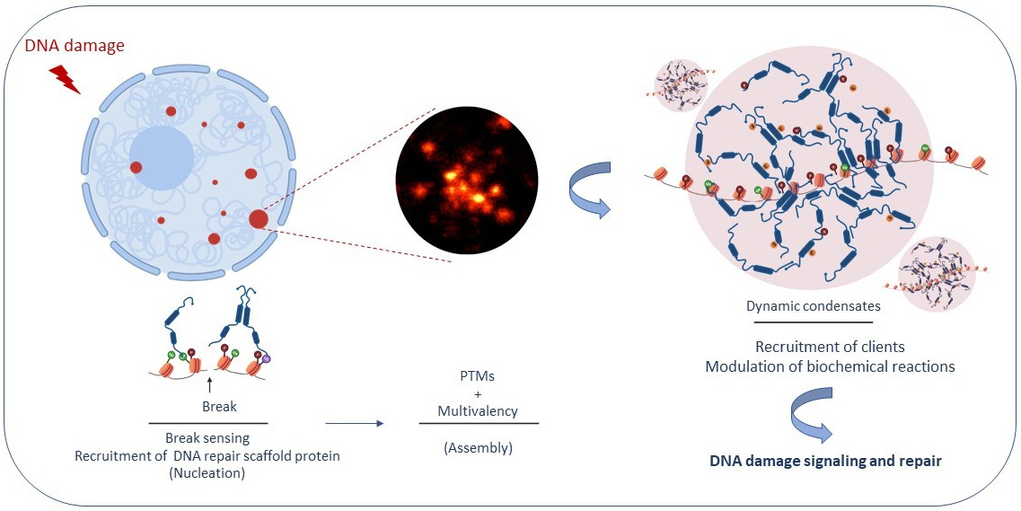 Our team aims to unravel the molecular mechanisms, functions, and regulatory principles governing stress-induced biomolecular condensates, with a particular focus on those involved in the DNA damage response. By integrating cell biology, structural biology, and advanced imaging approaches, we investigate how these condensates assemble, evolve, and function throughout the cell cycle, and how their composition and dynamics influence genome maintenance. A key objective is to understand how alterations in condensate organization contribute to cancer cell survival and proliferation. In collaboration with structural biology partners, we also explore the self-assembly properties of scaffolding proteins and develop innovative strategies to modulate condensate behavior, offering potential new avenues for therapeutic intervention.