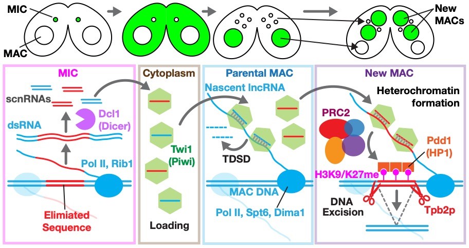 Small RNA-mediated transcriptional gene silencing is a vital defense mechanism shared by diverse eukaryotes from fungi and plants to flies, worms, and mammals. Its primary mission is to keep transposable elements (TEs) in check, preventing these genomic “jumping genes” from causing instability or disease. Small RNAs recognize and silence TEs through precise base-pairing, yet how cells achieve this selectivity without silencing normal genes remains an open question. The ciliated protozoan Tetrahymena offers a remarkable window into this process. During programmed DNA elimination (PDE), it distinguishes TE-derived sequences by comparing its germline and somatic genomes using small RNAs, an elegant example of epigenetic genome regulation and TE–host coevolution. Because DNA elimination can be synchronously triggered on a large scale in the lab, Tetrahymena provides a powerful system for dissecting small RNA-guided chromatin regulation at both genetic and biochemical levels. Using this “tiny, hairy” eukaryote, we aim to uncover how cells: selectively produce small RNAs from TE-related sequences, use them to recognize matching genomic regions, and build the silent chromatin landscapes (heterochromatin) that keep TEs under control.