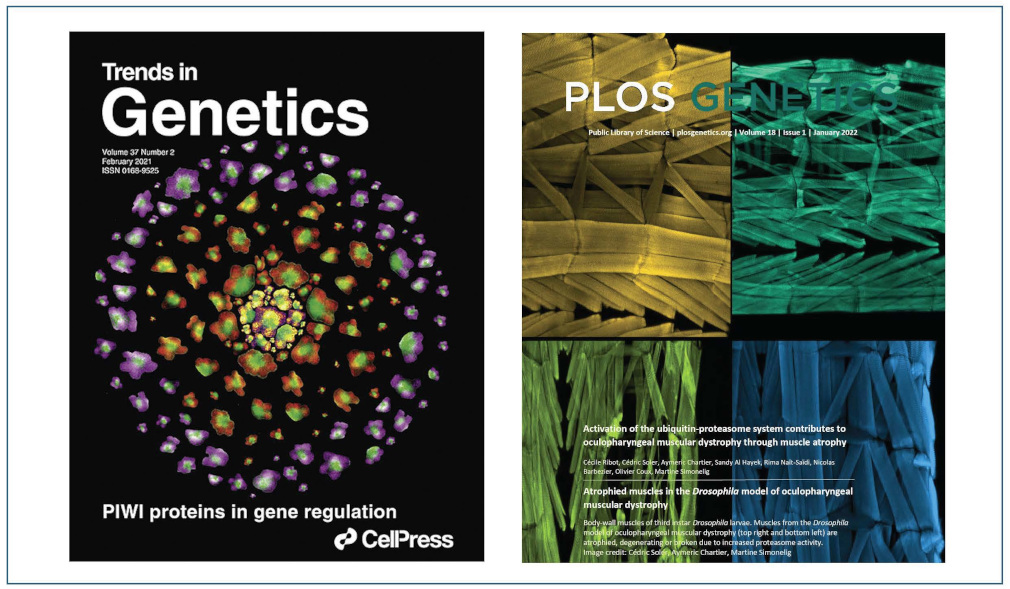 - Ribot C, Soler C, Chartier A, Al Hayek S, Naït-Saïdi R, Barbezier N, Coux O, Simonelig M (2022) Activation of the ubiquitin-proteasome system contributes to oculopharyngeal muscular dystrophy through muscle atrophy. PLoS Genetics, 18:e1010015. With cover
