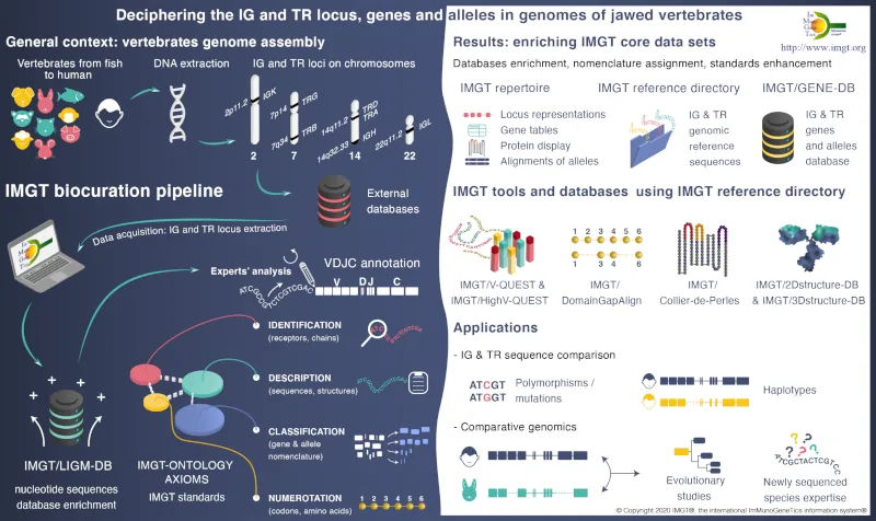IMGT, is recognized as the mondial reference for the richness and quality of its expertized data. IMGT® is certified ISO 9001 and NF X50-900. The IMGT databases, online tools, and web resources of the information system are enriched by the results of the 3 research and development axes dedicated to the deciphering of antigen receptor genomic loci, the analysis of expressed repertoires, and the study of 2D and 3Dstructures of natural and engineered adaptive immune proteins.