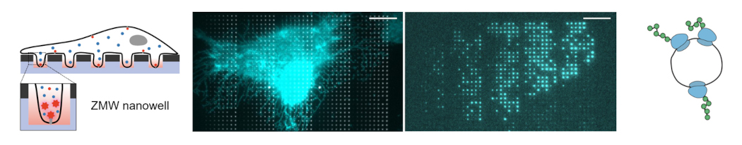 Live U2OS cell on the array of nanostructures called zero-mode waveguide (ZMW) nanowell for single-molecule fluorescence imaging. Adapted from Yang*, Klughammer*, and Barth* et al., ACS Nano (2023).